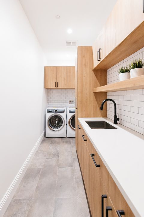 Dapur yang satu ini memiliki nuansa konsep putih ditambah dengan aksen warna coklat dari warna kayu pada interior. Yang unik di sini adalah dapur menyatu dengan ruangan cucian menyedihkan konsep minimalis sangat tampak pada ruangan ini. Memiliki pencahayaan yang bagus juga menjadikan kesan minimalis dan bersih ada pada ruangan ini.