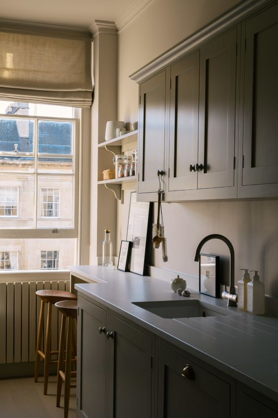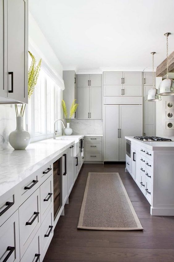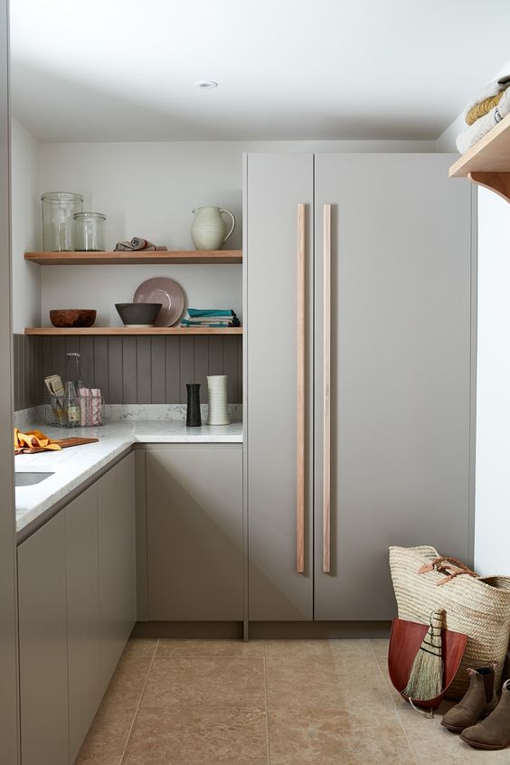Dapur yang satu ini mengedepankan nuansa abu-abu ditambah putih. Warna abu-abu di sini tampak dominan pada bagian interior seperti lemari, ditambah dengan aksen putih dari atap dan juga dindingnya menjadikan perpaduan warna yang menarik.