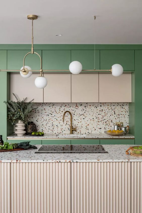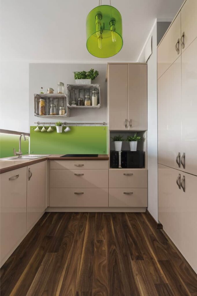 Dapur yang satu ini memiliki nuansa warna yang sangat menarik yaitu hijau dengan konsep warna hijau pastel. Menjadikan suasana pada dapur ini tampak alami dan juga menenangkan. Apalagi dengan ditambahkannya hiasan tumbuhan menjadikan dapur terlihat natural.