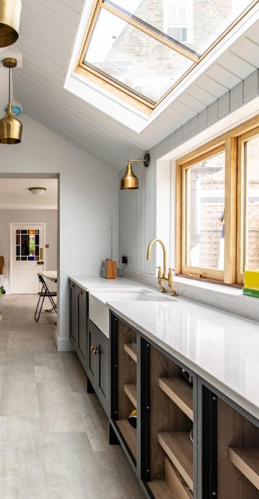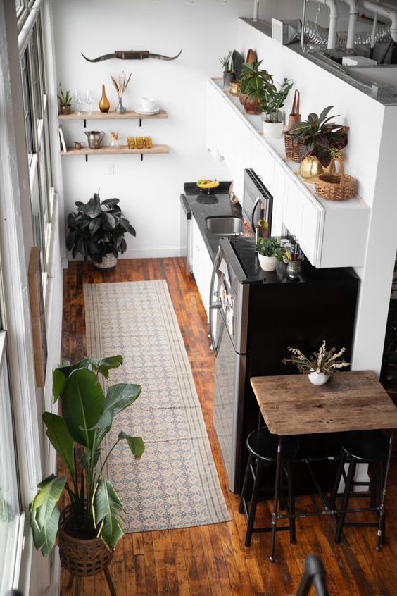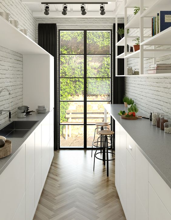 Dapur sempit yang pertama ini berkonsep putih baik di dinding maupun pada interiornya. Memiliki aksen warna coklat dari lantai dan juga lemari penyimpanan menjadikan tampilan dari dapur ini tidak monoton. Ditambah kejayaannya yang bagus menjadikan dapur ini terlihat bersih dan nyaman.