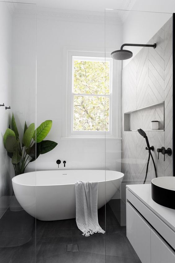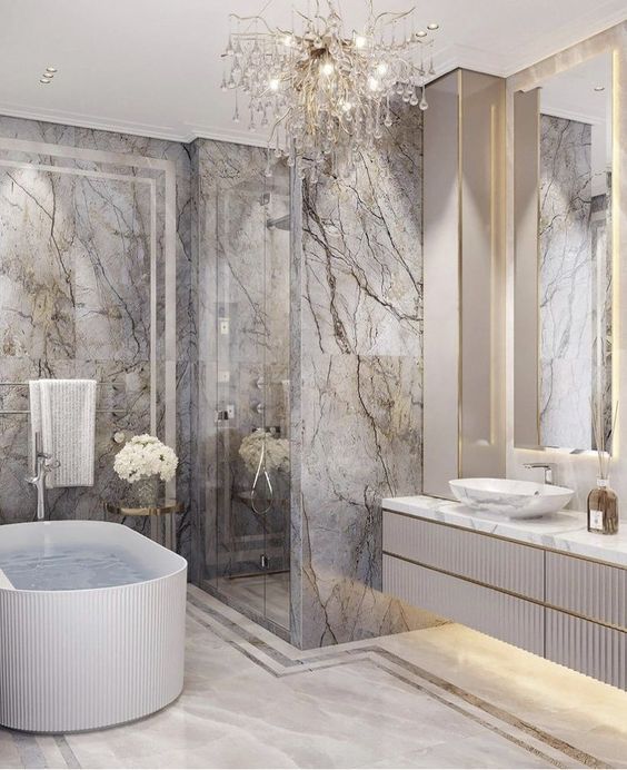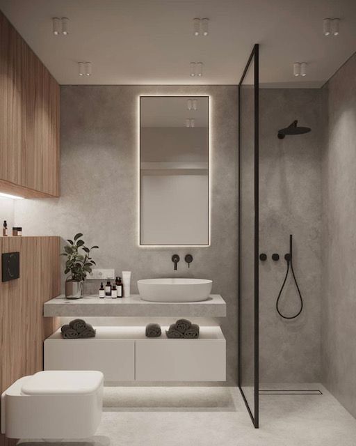 Kamar mandi mewah yang satu ini memiliki konsep minimalis dan juga elegan. Menggunakan perpaduan warna hitam dan juga abu-abu menjadikan kamar mandi ini ini terlihat modern. Pencahayaan yang bagus di sisi atas dan juga di sisi Tengah menjadikan kesan modern dan elegan semakin apa pada kamar mandi ini.