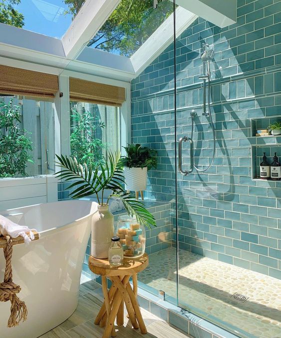 Desain kamar mandi yang satu ini mengedepankan nuansa alami yaitu dengan menggunakan beberapa interior yang terbuat dari kayu dan juga ditambah dengan tumbuh – tumbuhan. Memiliki andil yang sangat besar di atas yang dapat digunakan sebagai masuknya cahaya dari luar menjadikan kamar mandi ini terasa nyaman.