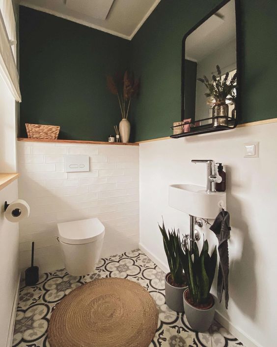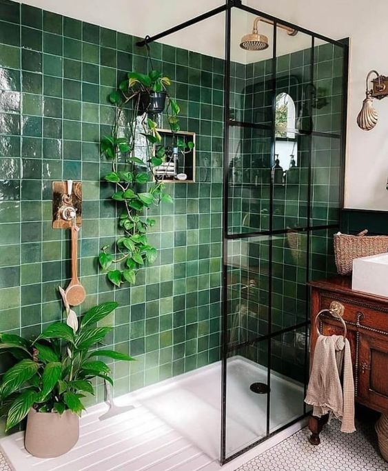 Kamar mandi yang satu ini mengusung tema desain minimalis dengan nuansa perpaduan warna hijau gelap dan juga putih. Kurma hijau di sini digunakan hanya untuk bagian atas kamar mandi, tidak hanya itu warna hijau di sini juga dihasilkan dari beberapa tumbuhan yang ada di dalam kamar mandi ini. Warna putih disini ada di bagian interior dan juga bawah dinding kamar mandi. Perpaduan warna ini menjadikan kamar mandi terlihat natural dan elegan.