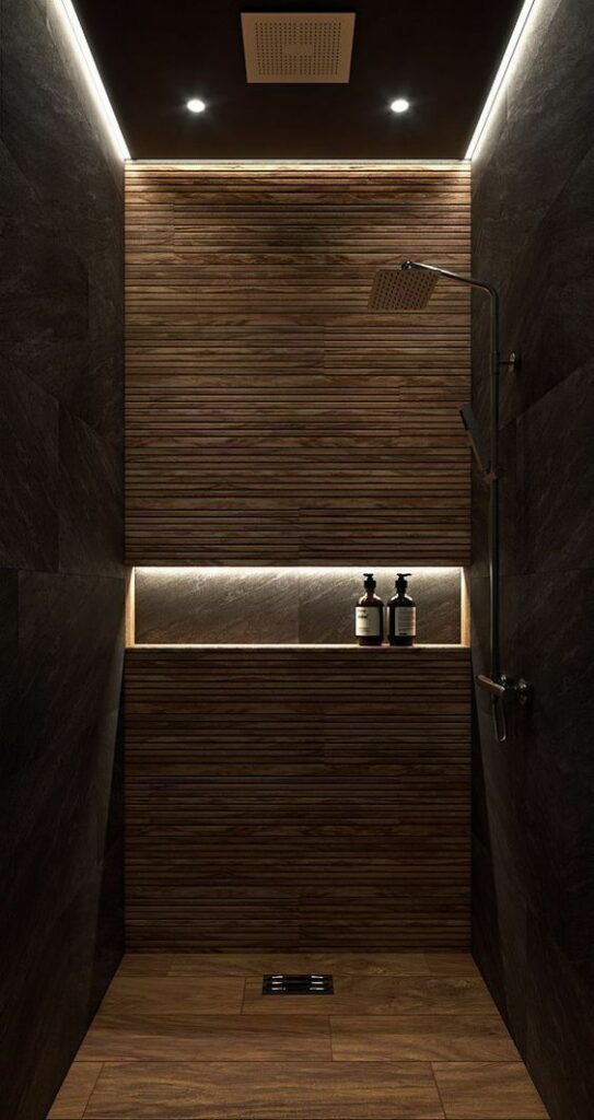 Kamar mandi yang satu ini sangat elegan ketika dipandang karena memiliki perpaduan warna hitam dan juga coklat. Hitam di sini menggunakan marmer sedangkan warna coklat menggunakan pattern kayu. Ditambah pencahayaan yang bagus membuat kamar mandi ini makin elegan.