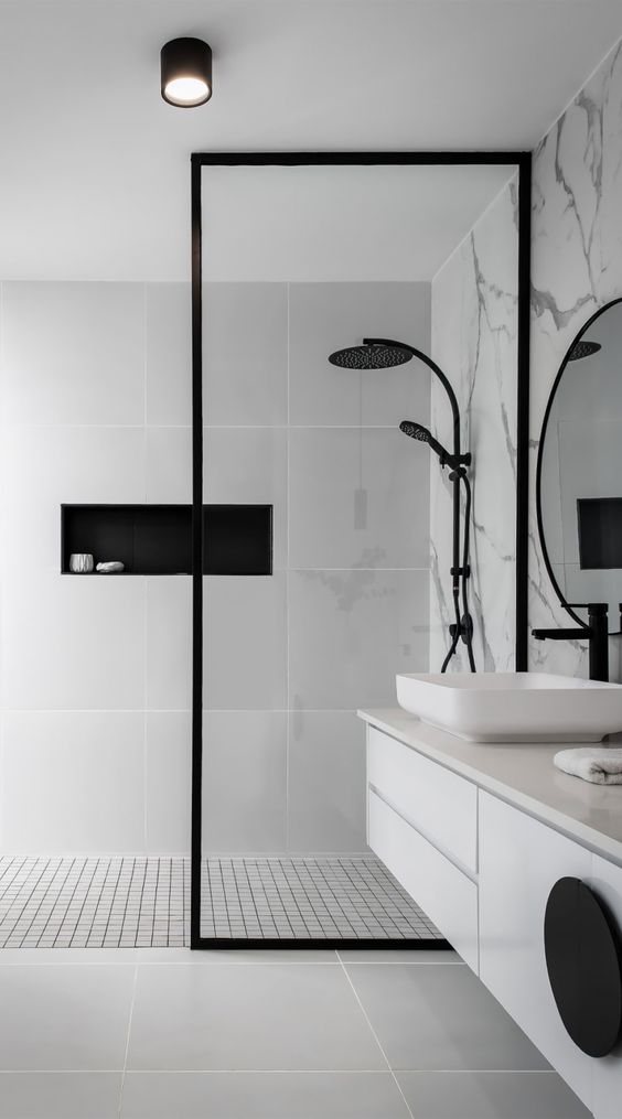 Nuansa yang ditawarkan oleh kamar mandi ini adalah minimalis dengan Dominasi warna hitam dan juga putih. Warna putih terletak pada dinding interior seperti lagi dan juga atapnya. Sedangkan warna hitam terletak pada bagian frame kamar mandi, shower dan frame kacanya.