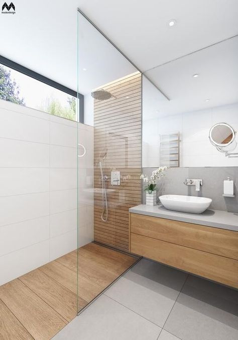Kamar mandi ini mengusung nuansa minimalis dengan corak warna yang dominan yaitu putih dan juga coklat. Memiliki kaca yang sebagai penyekat antara shower dan juga menjadikan kamar mandi ini terkesan menarik. Warna coklat yang dihasilkan dari interior berbahan dasar kayu juga makin mempercantik kamar mandi ini.