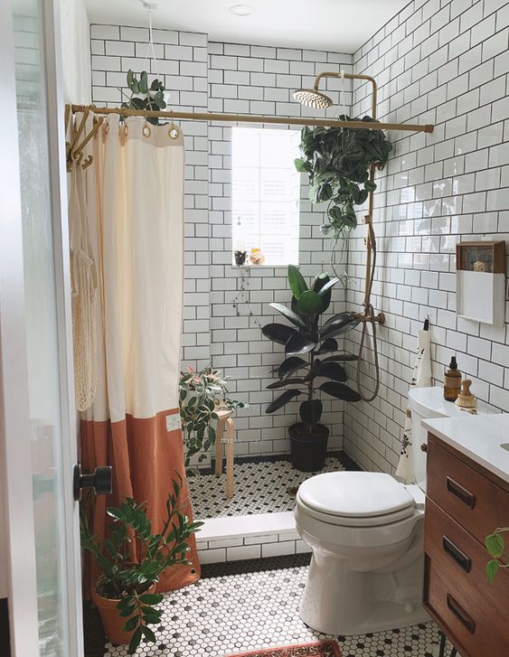 Kamar mandi yang satu ini cukup unik dana menggunakan double balok pada seluruh dindingnya, menggunakan pattern balok menghasilkan nuansa yang klasik pada kamar mandi ini. Ditambah dengan aksesoris seperti beberapa tanaman menjadikan kesan kamar mandi ini alami dan juga bersih.